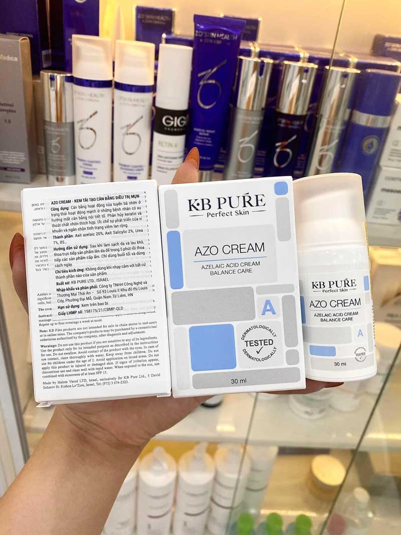 - Kb Pure Azo Cream điều trị mụn: KB Pure Azo Cream chứa Salicylic acid, giúp loại bỏ tế bào chết và làm sạch lỗ chân lông, giảm viêm, giảm sưng và làm dịu mụn sưng tấy.