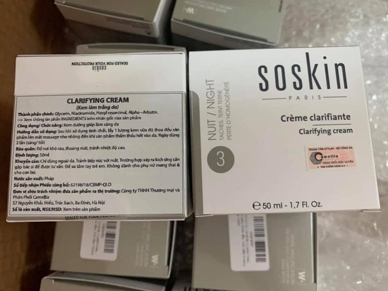 - Sản phẩm Soskin Clarifying Cream là sự kết hợp hoàn hảo của các tính chất dưỡng trắng da, được hội tụ với công nghệ tiên tiến D-White để mang lại một làn da trắng sáng thần kỳ với tốc độ rất nhanh chóng.